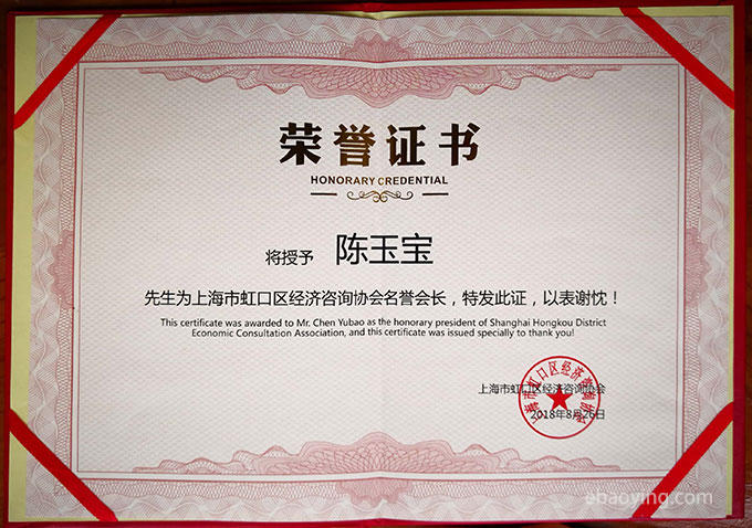熱烈祝賀寶英集團董事長陳玉寶榮獲“上海市虹口區(qū)經(jīng)濟咨詢協(xié)會名譽會長”!